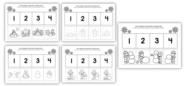 • 5 dažādas darba lapas, kurās ir dots uzdevums veidot sniegavīru stāstu. Izkrāso attēlus, izgriež tos un secīgi tos pielīmē no 1-5.