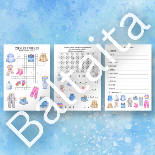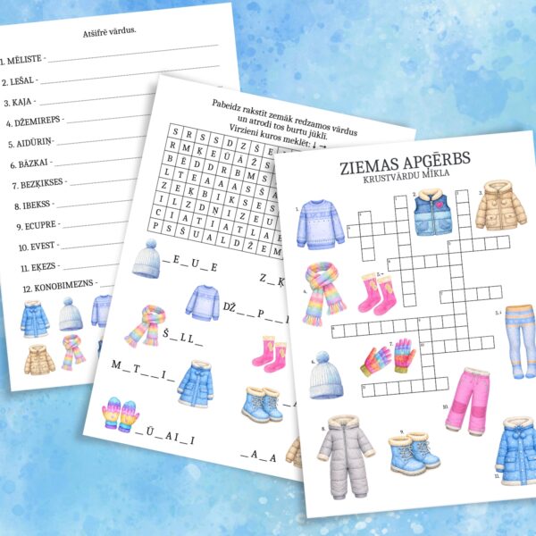 Šīs interesantās vārdu spēles ietver burtu jūkli, kurā jāatrod ar ziemas apģērbu saistīti vārdi, kā arī pareizi jāieraksta to nosaukumi, krustvārdu mīkla, kurā būs jāatrod 12 vārdi, kā arī vārdu šifrēšanas darba lapa, kurā jāatšifrē 12 dažādi vārdi, kuru burti ir sajaukti vietām.
