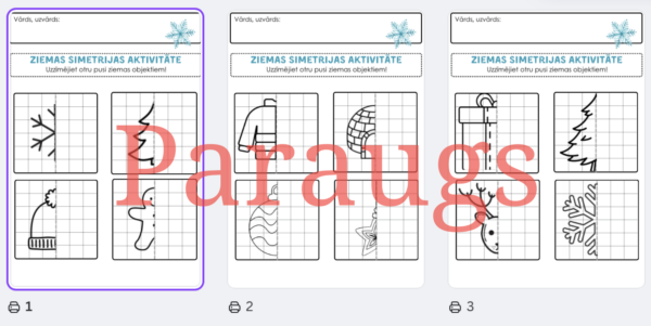 Interaktīva ziemas tematikas darba lapa, kas palīdz bērniem attīstīt simetrijas izpratni, uzmanību un radošās prasmes. Uzdevums ir pabeigt ziemas objektu otru pusi, vadoties pēc simetrijas principa — bērni trenē telpisko uztveri, līniju vilkšanu, precizitāti un vizuālo domāšanu.