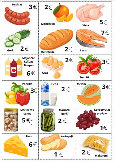 Bērni produktiņus izgriež un izvēlētos var ielīmēt grozā. Blakus pierakstot cenas un aprēķinot kopsummu.