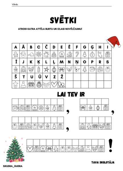 Uzdevums- atkodēt skolotājas novēlējumu, katram attēlam piemeklējot atbilstošo burtu. Novēlējums: Lai Tev ir sirsnīgi, mīļi, priecīgi, jauki Ziemassvētki!