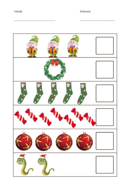 Spēle sastāv no divām darba lapām, kurās bērniem jānoskaita dažādi Ziemssvētku tematiskas objekti un jāieraksta pareizas skaits tukšajā lodziņā.