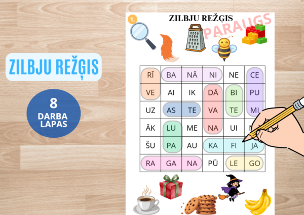 Bērns aplūko attēlus un meklē to nosaukumu zilbes zilbju režģī, savienojot zilbes pareizā secībā. Uzdevums veicina zilbju atpazīšanu, vārdu lasīšanas prasmi, uzmanību un loģisko domāšanu.