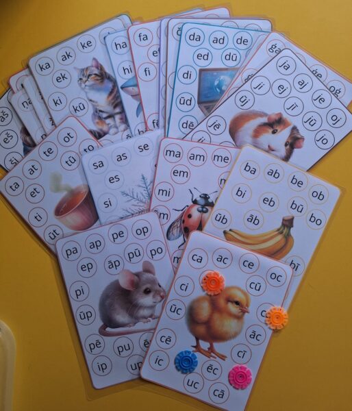 Materiālā ir 24 A5 formāta kartiņas ar atvērtām un slēgtām zilbēm. Visi alfabēta līdzskaņi. Noteikumi- izlasi zilbi uzliec riņķiti, pogu utt, vai nostrīpo izlasīto.