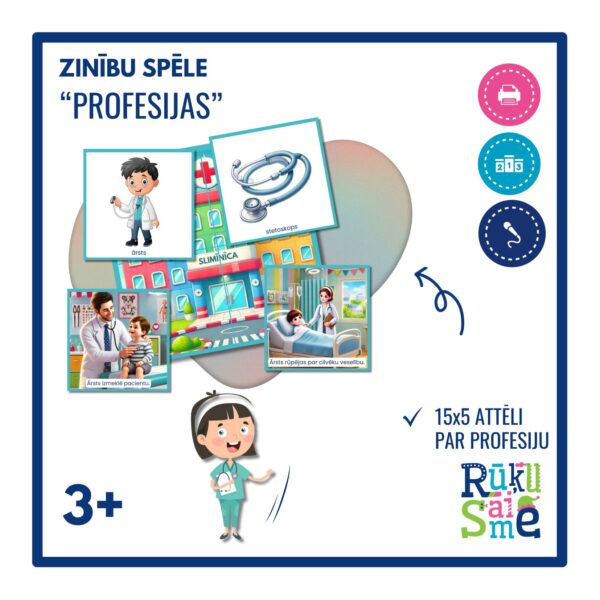 - Jaunākajiem bērniem: Izmanto “Pāru kartītes,” kur bērni savieno profesijas attēlu ar atbilstošu darba instrumentu (piemēram, ugunsdzēsējs – šļūtene).